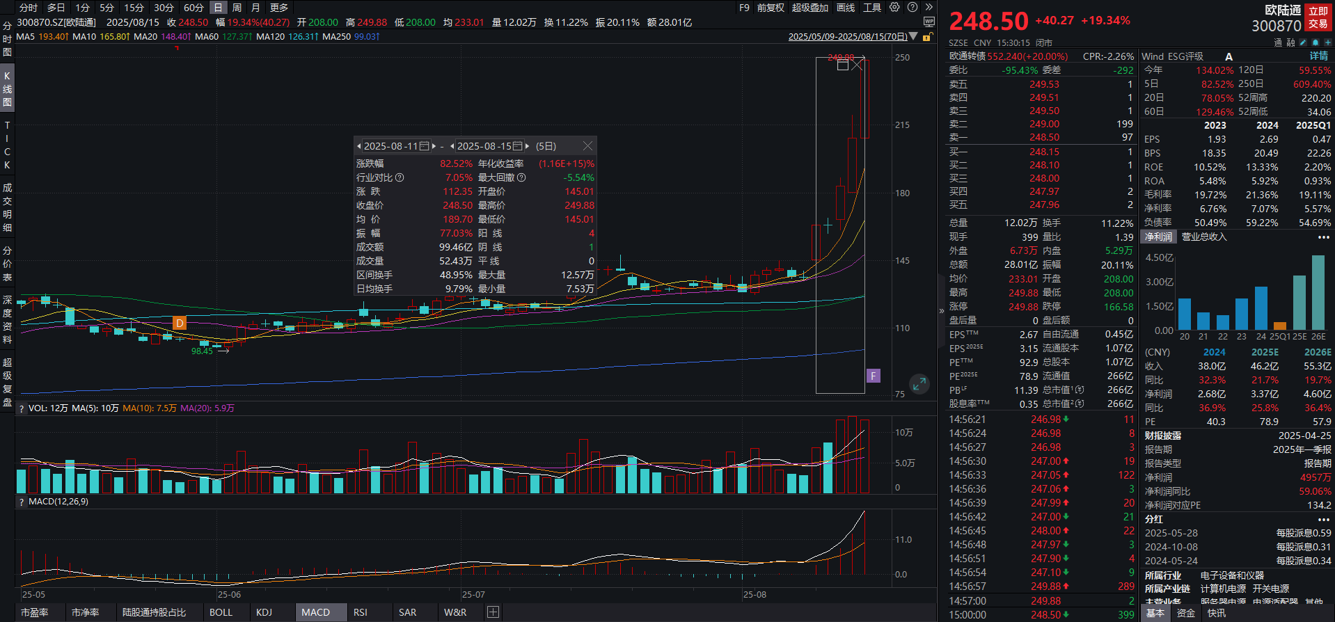 二级市场方面,近一周,欧陆通累计涨幅近83%,8月15日盘中价格报249.88元/股,创上市以来新高。