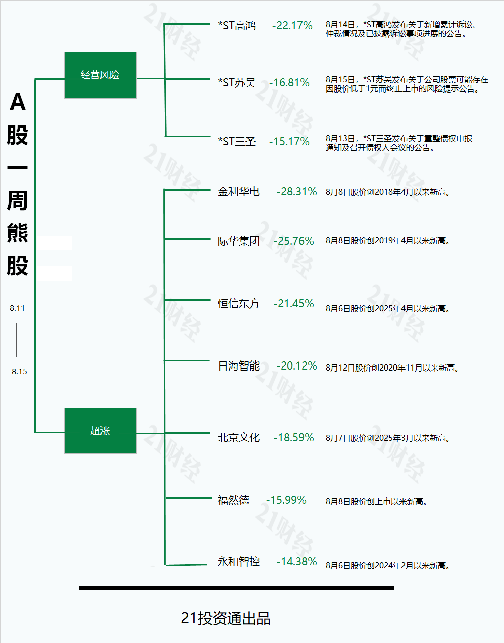 本期十大熊股中(剔除近一周上市的次新股),金利华电(300069.SZ)周跌28.31%成为最熊股,际华集团(601718.SH)、*ST高鸿(000851.SZ)、恒信东方(300081.SZ)、日海智能(002313.SZ)等跌幅均在20%以上。本周熊股榜10只个股周跌幅均超14%。